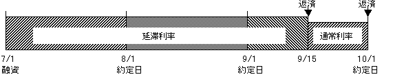 約定日8/1を遅れて、9/15に一度支払う。 → 約定日8/1より遅れたので延滞利息で計算。 → 残元金(7/1)×25.55%/365日(延滞利率)×76日(7/1-9/14) → 約定日を10/1に更新