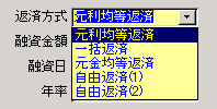 プルダウンメニュー(償還表で「返済方式」など)での項目選択は「Alt」キ-を押しながら「↓」キ-を押すと、メニュ-が現れます。「↓」、「↑」キ-で選択し、「Enter」キ-で確定します。 |